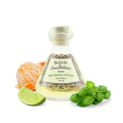 Our Reed Diffusers are a flameless way to bring the bright and clean scent of Basil Mandarin with Lime into the home. Give the whole room a shower-fresh, sparkling fragrance with a lively citrus splash that calms into a subtle trail of sweet basil.